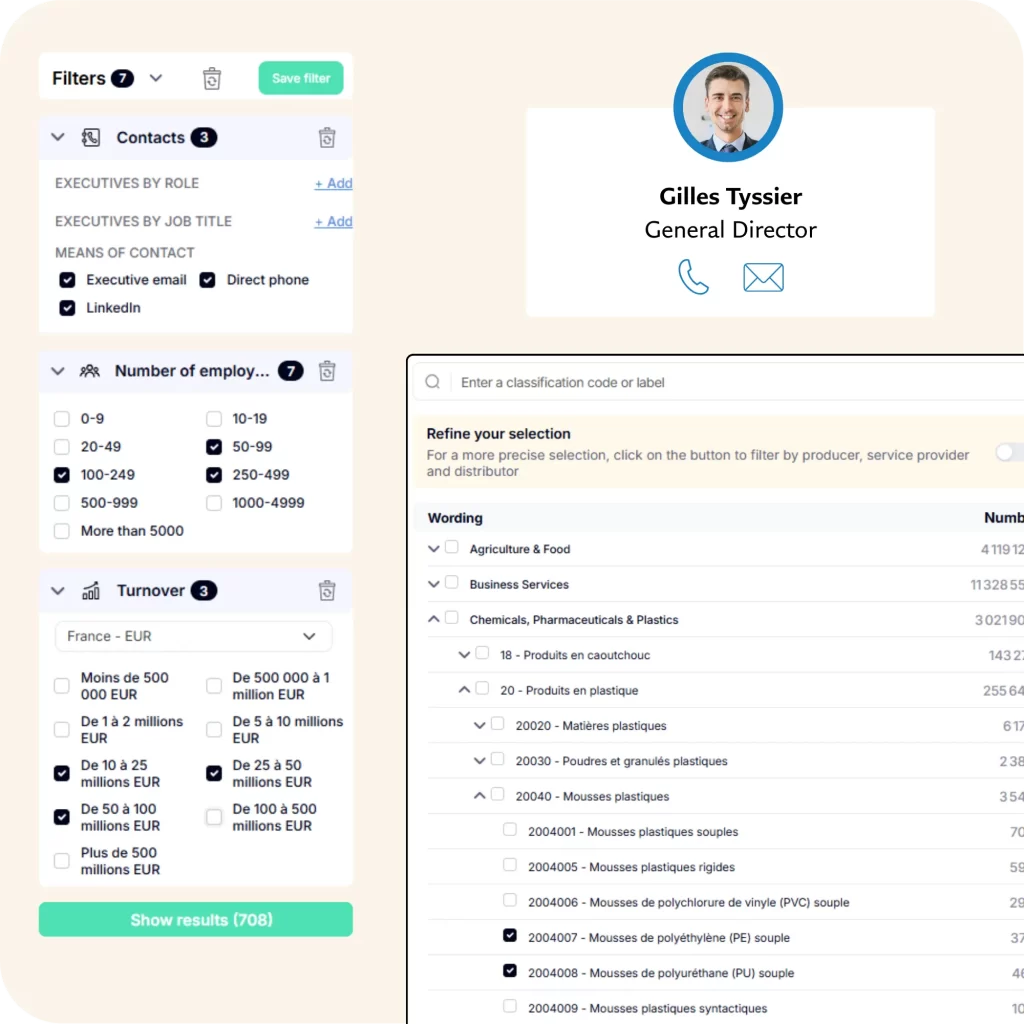 Combine industry codes, company size, keywords, and locations with semantic search to pinpoint the right leads.